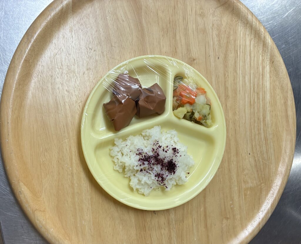 給食はゆかりごはん、唐揚げ、ポテトサラダです。