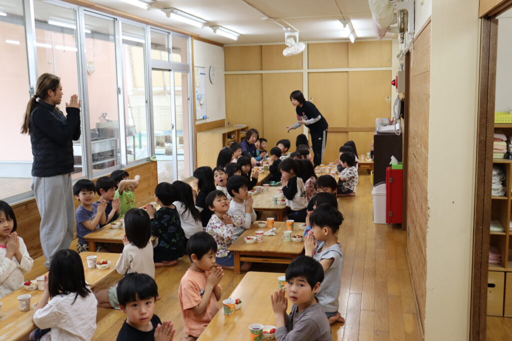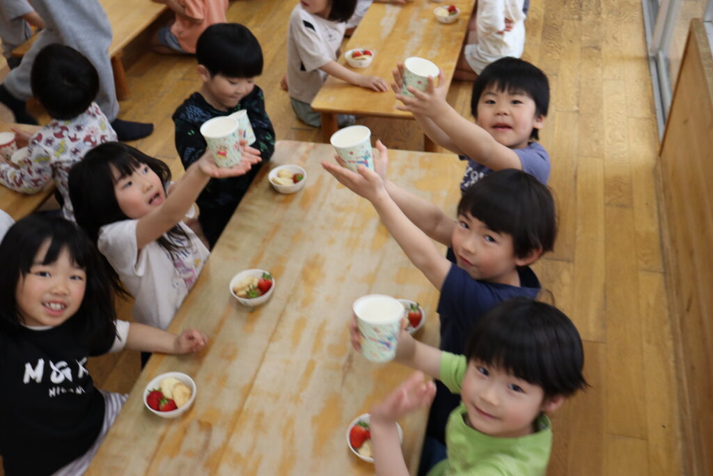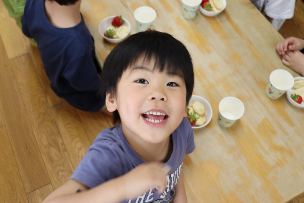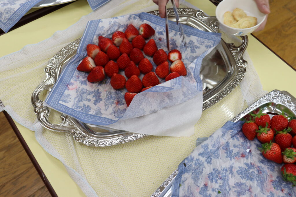 おやつはブドウジュース、クッキー、いちごです。